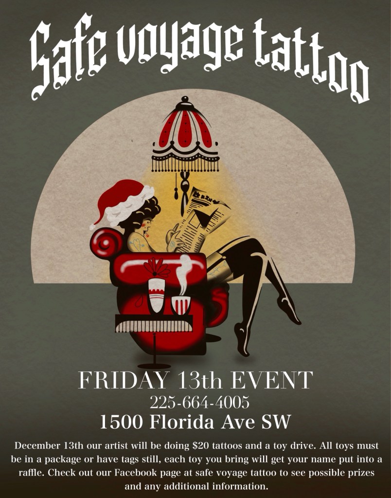 Safe Voyage Tattoo 12 year anniversary and Friday the 13th party. We will have vendors, tats , and so much more!